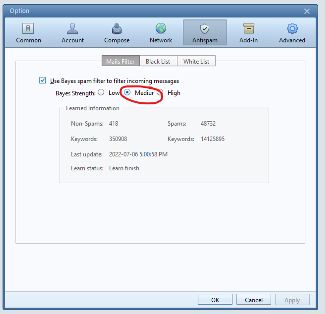To increase the spam filtering level can change to medium.