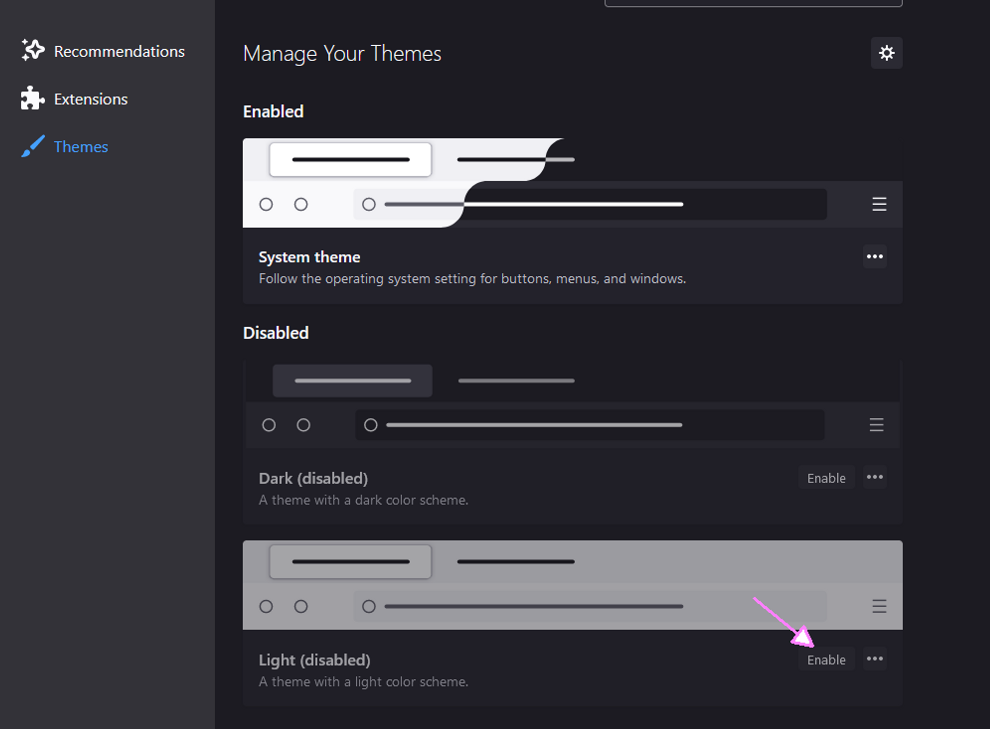 Select a theme in the list, click the Enable button.