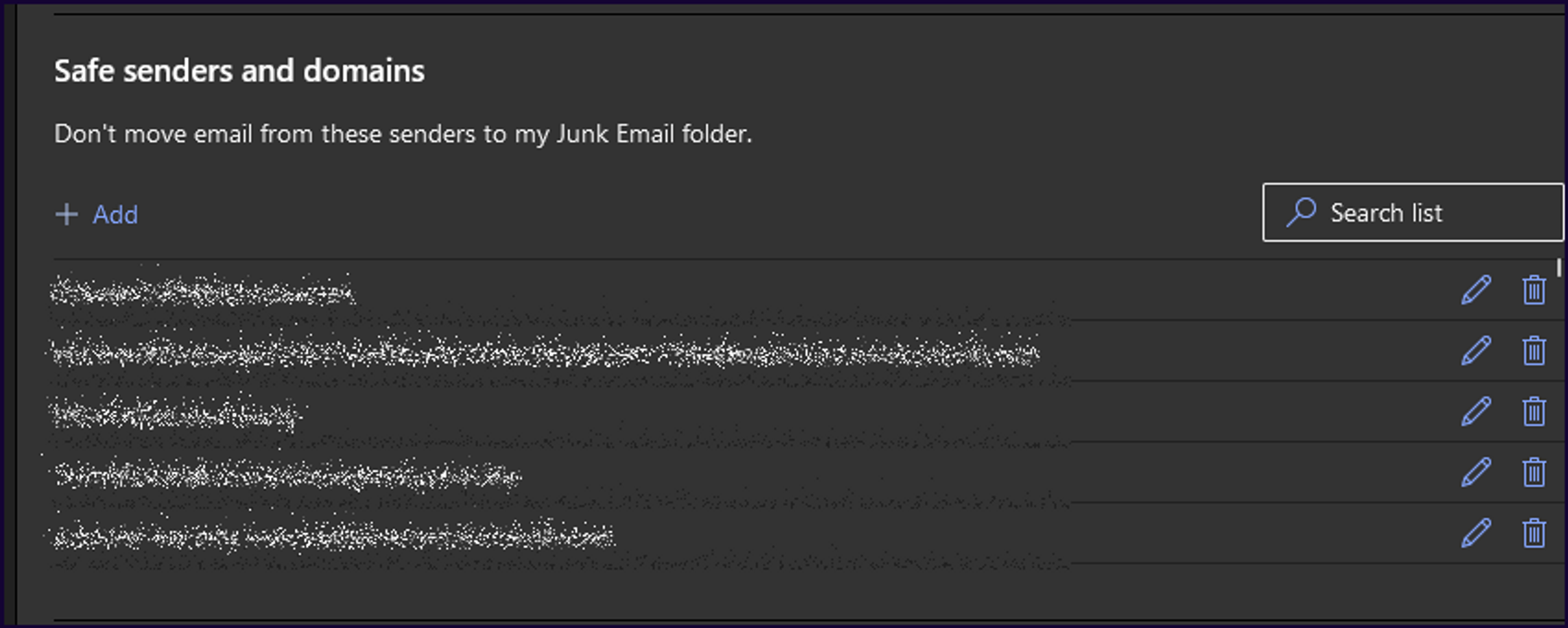 - Click on the “+” icon to add the email address or domain to your safe senders list.