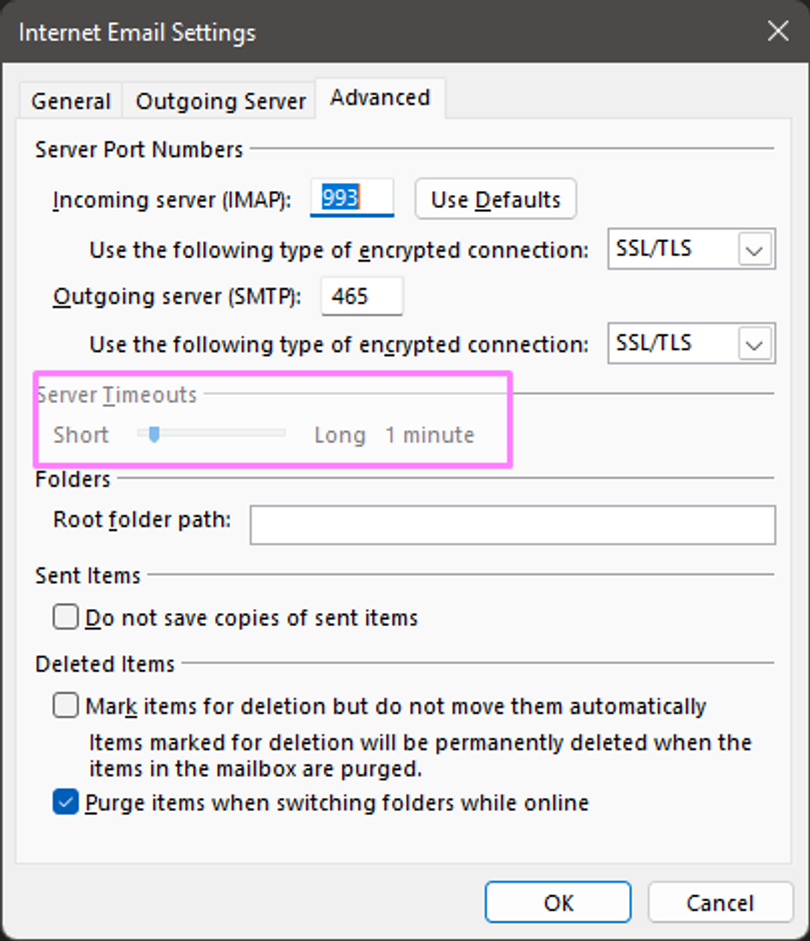 - A dialog box pops up called the “Internet Email Settings” window; tap on the “Advanced” option. Increase the time limit to 10 mins under “Server Timeouts”. Select “OK”.